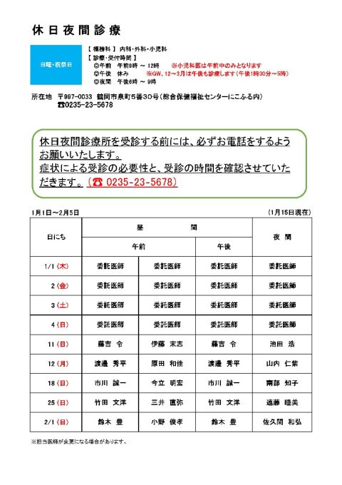 休日夜間診療当番表(1/1~2/5)を更新しました