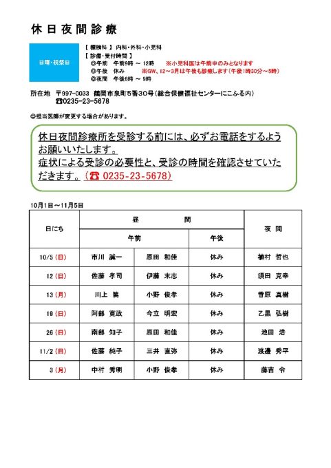 休日夜間診療当番表(10/1~11/5)を更新しました