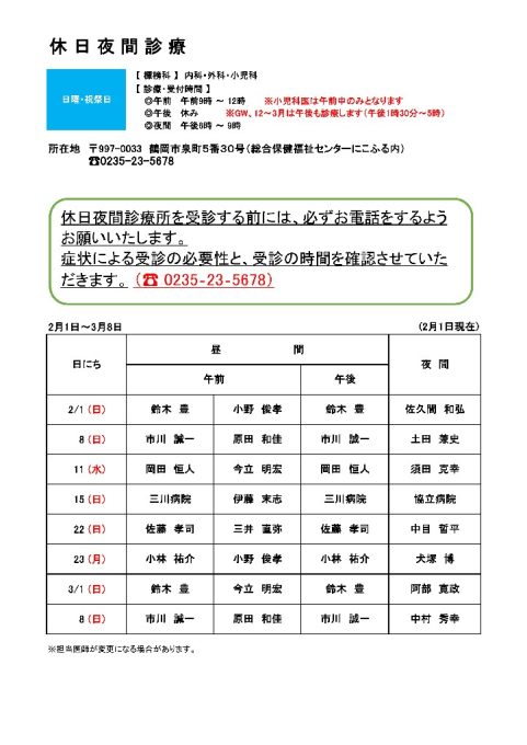 休日夜間診療当番表(2/1~3/8)を更新しました