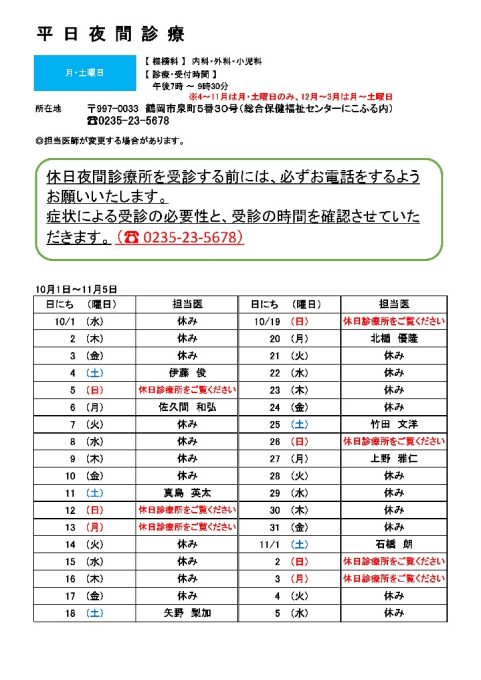 平日夜間診療当番表(10/1~11/5)を更新しました