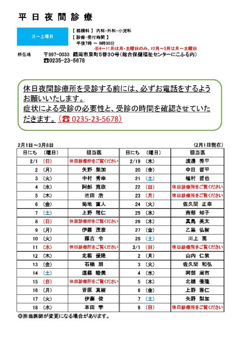 平日夜間診療当番表(2/1~3/8)を更新しました